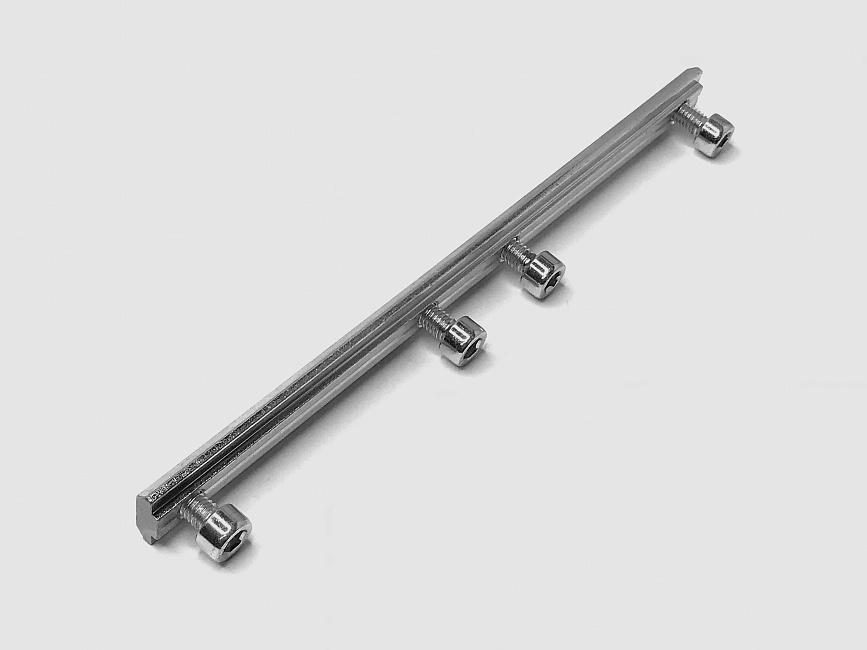 Жесткий соединитель длиной 180 мм с резьбой М6, предназначенный для стыковки двух алюминиевых профилей в торец. Устанавливается внутри паза шириной 8 мм. Ключевая особенность — создание неразъемного и прочного линейного соединения. Плюсы — простота сборки длинномерных конструкций, сохранение соосности профилей. Используется при сборке длинных направляющих, балок, каркасов.