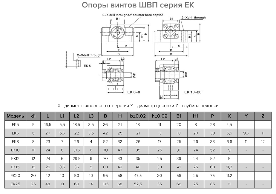 Опора ходового винта серии EK — это фиксирующая опора для жесткого крепления приводного конца винта. Она относится к компактным опорам и отличается способом крепления – монтаж осуществляется параллельно монтажной плоскости, что удобно в условиях ограниченного пространства. Широко применяется в автоматизации и промышленных механизмах, включая оборудование с ЧПУ. Как и другие фиксирующие опоры, используется в комбинации с поддерживающей опорой, в данном случае – серии EF.