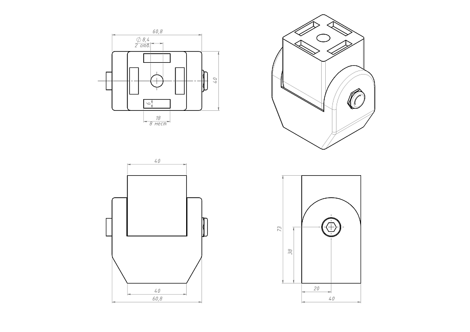 Соединитель для параллельного соединения двух профилей 40х40 в одной плоскости. Позволяет надежно стыковать профили в линию, сохраняя их соосность.