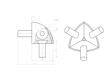 Трехсторонний соединитель размером 20x20 мм используется для создания угловых соединений между тремя профилями под углом 90 градусов. Для установки этого элемента требуется применение метчика для нарезания резьбы в профиле.
