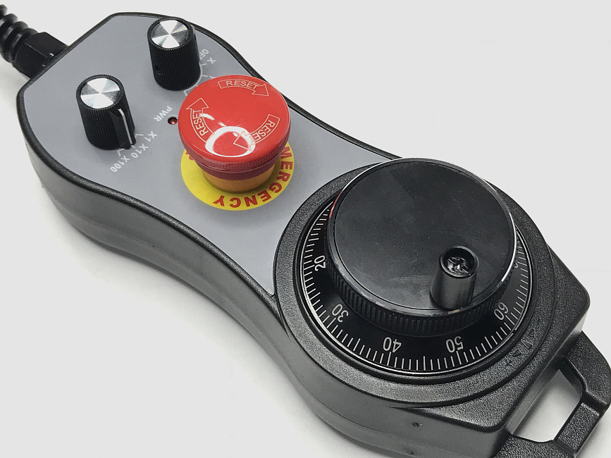 Портативный 4-осевой контроллер для станков с ЧПУ, совместимый с контроллером DDCSV3.1. Пульт обеспечивает гибкое ручное управление с выбором оси (X, Y, Z, 4-я) и переключателем шага (x1, x10, x100) для точного позиционирования. Оснащен грибковой кнопкой аварийной остановки, светодиодной индикацией состояния и имеет магнитное основание для удобного размещения на металлических поверхностях станка. В комплект входит экранированный кабель длиной около 2 м.