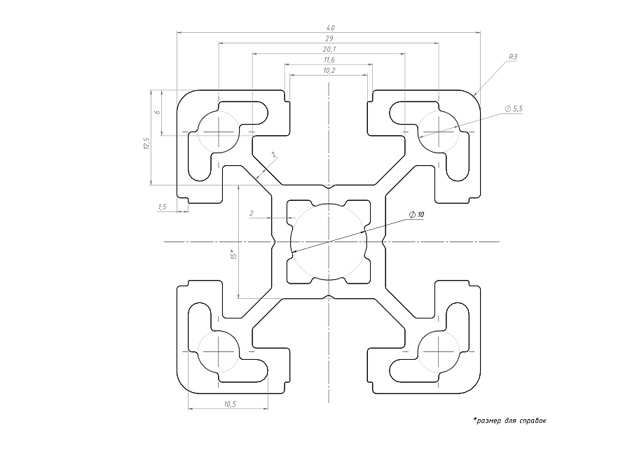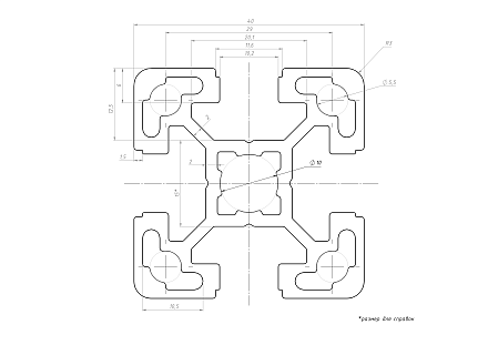 Данный алюминиевый профиль сечения 40х40 мм относится к наиболее универсальной и востребованной на рынке серии. Его ключевой конструктивной особенностью является уменьшенный внутренний диаметр центрального канала, стандартизированный под диаметр 10 мм. Это обеспечивает идеальную совместимость с огромным ассортиментом стандартного крепежа и фурнитуры, специально разработанных для паза 10 мм, включая Т-гайки, сухари, адаптеры и соединители. Благодаря такому решению достигается оптимальный баланс между высокой прочностью соединений, эстетикой сборки с утопленным крепежом и удобством монтажа. Основные плюсы профиля — исключительная взаимозаменяемость компонентов, надёжность создаваемых каркасов и скорость сборки за счёт отработанной стандартизированной системы.