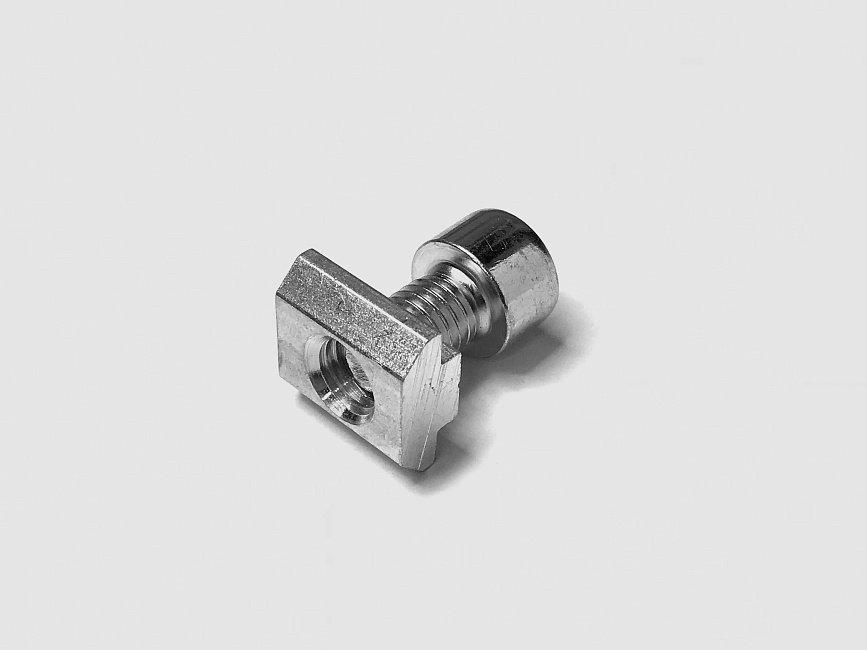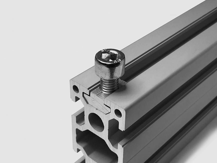 Сухарь пазовый позволяет крепить к профилю различные дополнительные элементы и конструкции, используя болты и винты с соответствующей резьбой. Сухарь вводится в паз с торца профиля. Отличие данных элементов от Т-гаек заключается в их большей площади контакта и большей несущей способности.