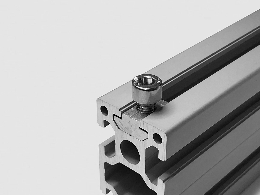 Сухарь пазовый позволяет крепить к профилю различные дополнительные элементы и конструкции, используя болты и винты с соответствующей резьбой. Сухарь вводится в паз с торца профиля. Отличие данных элементов от Т-гаек заключается в их большей площади контакта и большей несущей способности.