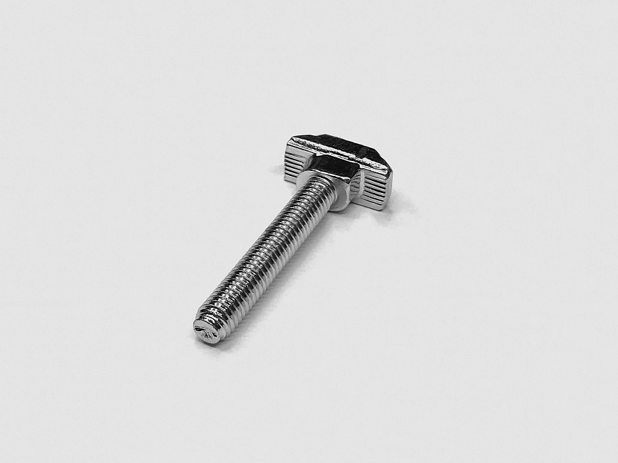 Т-болт М6х40 предназначен для монтажа различных компонентов и конструкций на профиль с использованием нужных гаек. Он устанавливается либо с торца профиля, либо непосредственно в продольный паз по всей его длине. Фиксация обеспечивается вращением болта при закручивании гайки.